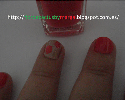 No me gusta recargar demasiado todas las uñas, aunque según como me pegue... La opción de hoy se trata de toda la mano en un tono coral, muy de primavera/verano, y en el dedo índice un color muy neutro con unos dibujos en forma de flor (o eso he intentado).