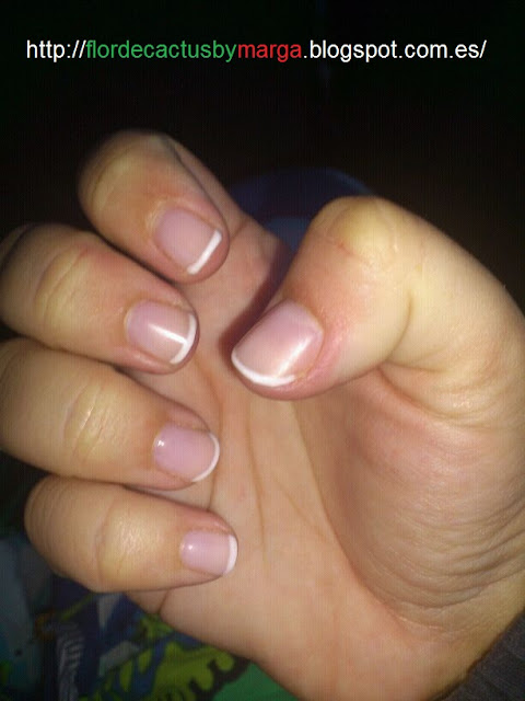 La perfección de esta manicura también depende de la destreza de quien te lo haga y ya que va a durarnos bastante tiempo, considero que es necesario que se esmere tanto a la hora de hacer la rayita de la francesa, como también a la hora de poner el producto base, ya que en alguna uña tenía algún pegote de producto y deformaba un poco la uña.